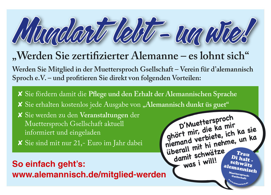 Uns Muetterspröchler liegt unsri schön alemannisch Sproch am Herze. Mir wän, dass sie erhalte blibt. Dodefür schaffe mr.